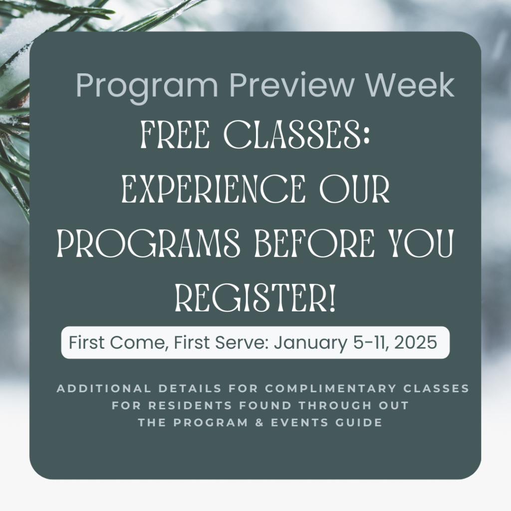 Details for complimentary classes for residents can be found throughout the Program & Events Guide.