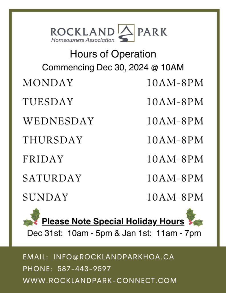 The Rockland Park Homeowners Association is so EXCITED to be open for our Rockland Park residents! Many have already stopped by for a visit… If you have not yet… We would love to see you! Our hours of operation are listed below! We hope to see you soon!