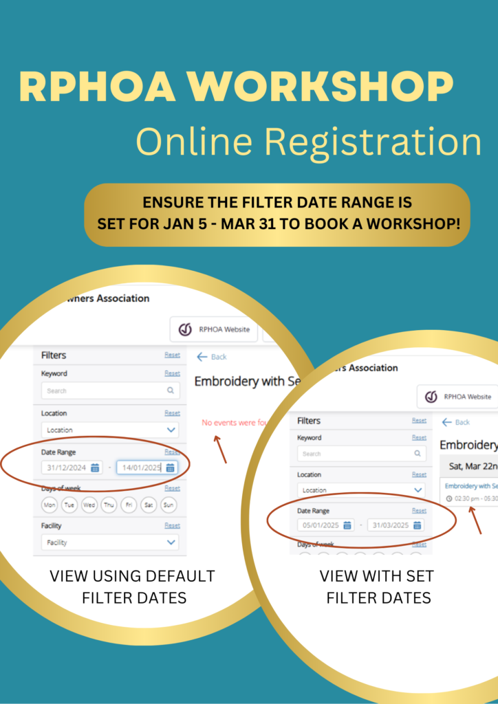 Important to know when booking a RPHOA Workshop online! The RPHOA has recently received inquires from residents unable to book workshops online. We have discovered the challenge! The system is defaulting to only show 2 weeks of available workshops in the filter. By adjusting the filter dates (on the left of your screen) to show […]