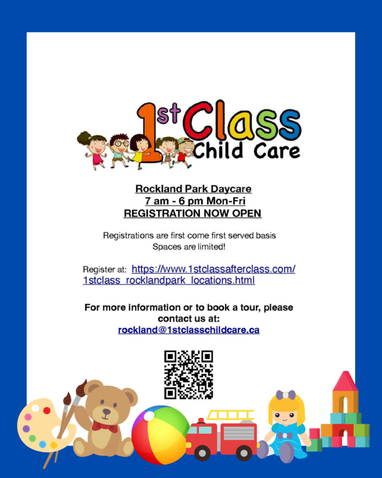 The Rockland Park Homeowners Association is excited to announce a very special partnership with 1st Class Childcare! 1st Class Childcare will be operating a Daycare out of the Lodge…in your backyard of Rockland Park, commencing March 1, 2025!  Registration is now open, with priority given to Rockland Park residents. Check out the link below, for more details and to register: